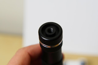 O corpo é em alumínio e tem muito boa qualidade, por baixo temos o local para aceder às pilhas e também tem rosca para se poder colocar o estabilizador num tripé ou acessório equivalente.